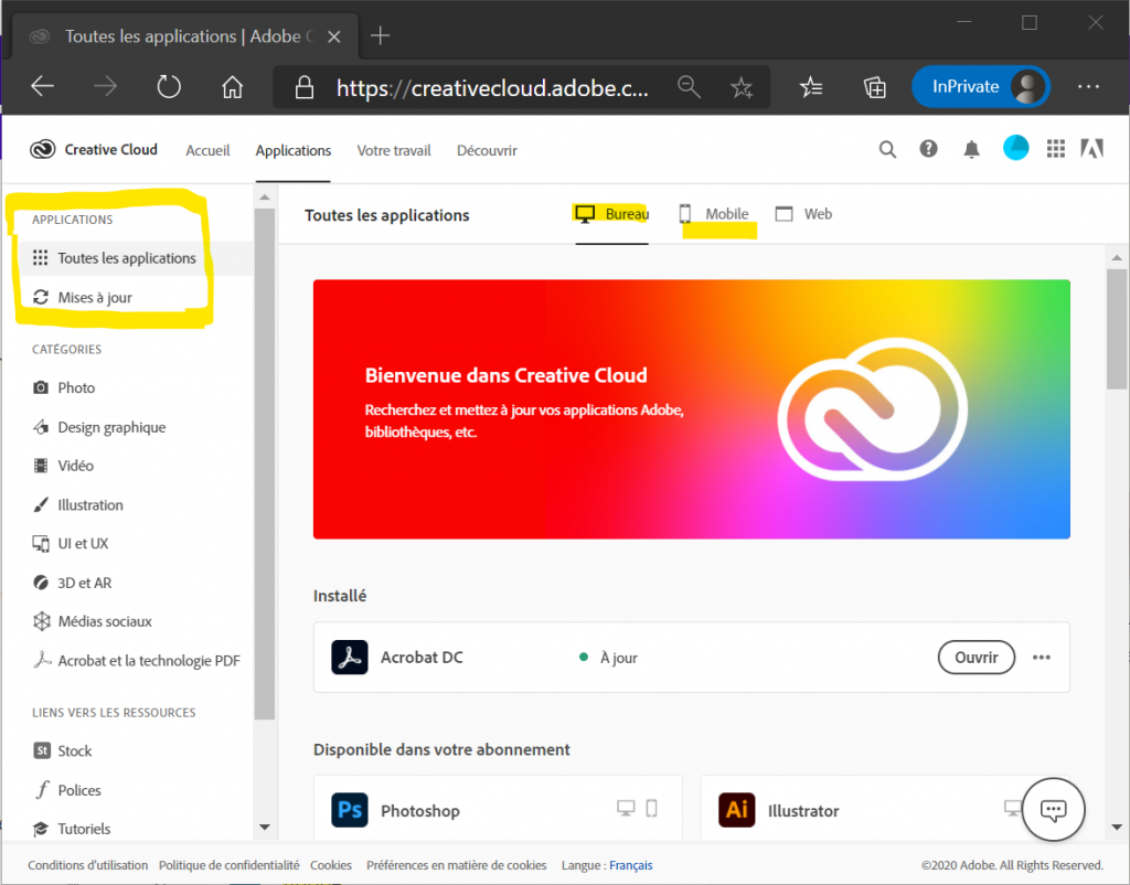 1 - Connexion au site d'adobe : https://creativecloud.adobe.com/apps